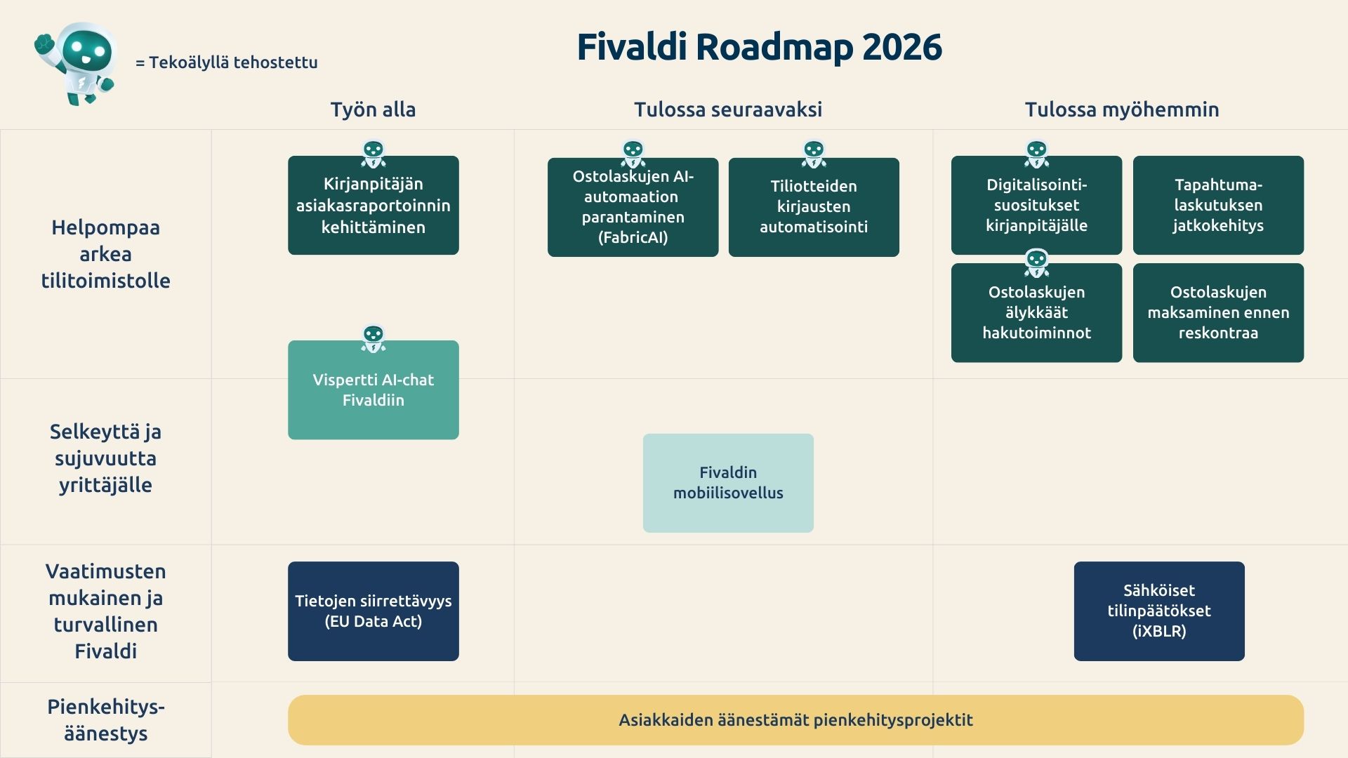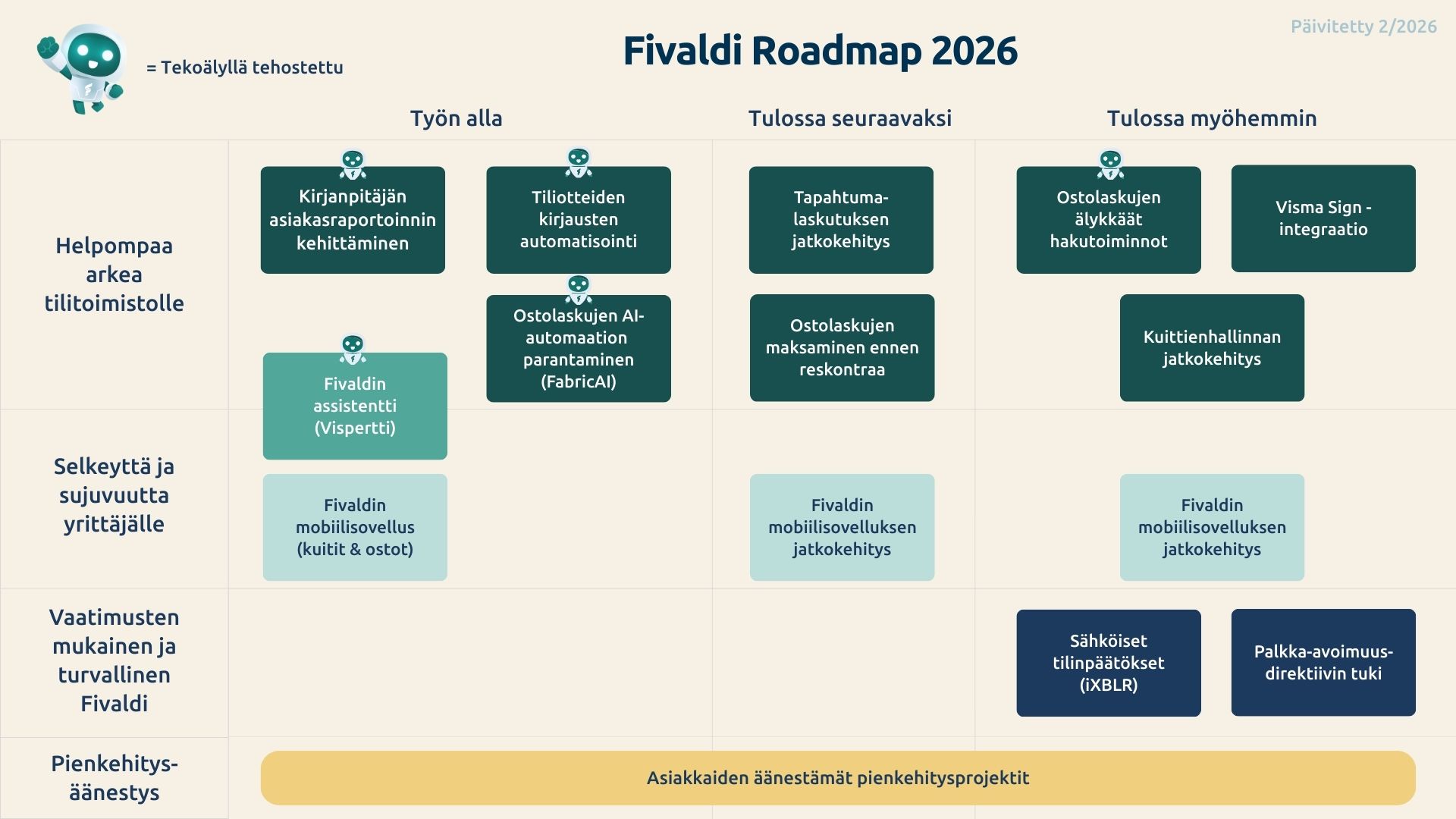Vuonna 2026 keskitymme edelleen parantamaan kirjanpitäjän käyttökokemusta ja tehostamaan tilitoimiston arkea vähentämällä kirjanpitäjän arjen rutiinitöihin kuluvaa aikaa. Tuomme Fivaldiin myös useita tekoälyllä tehostettuja ominaisuuksia.